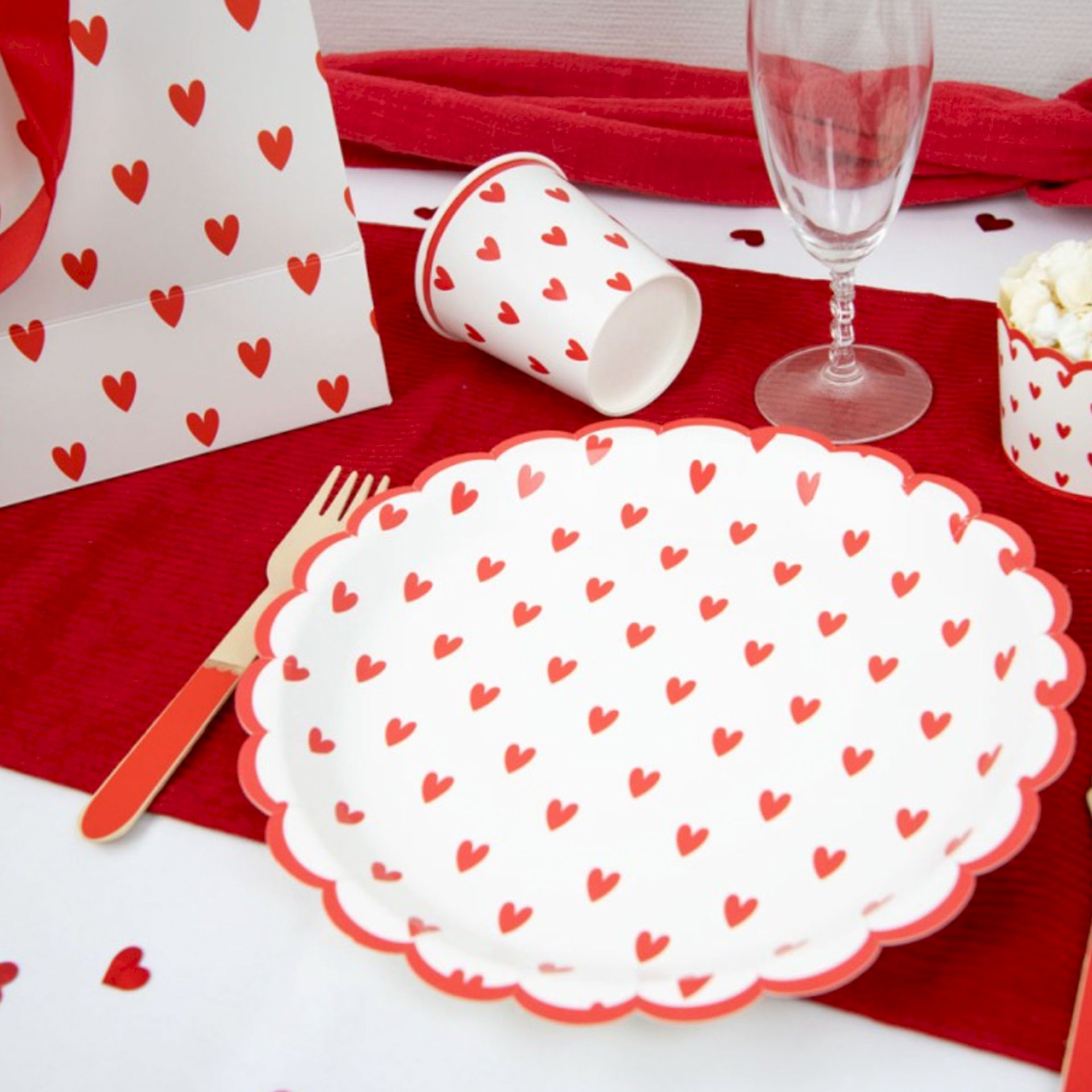 Lot de 8 assiettes avec un motif petits coeurs et un galon festonné rouge