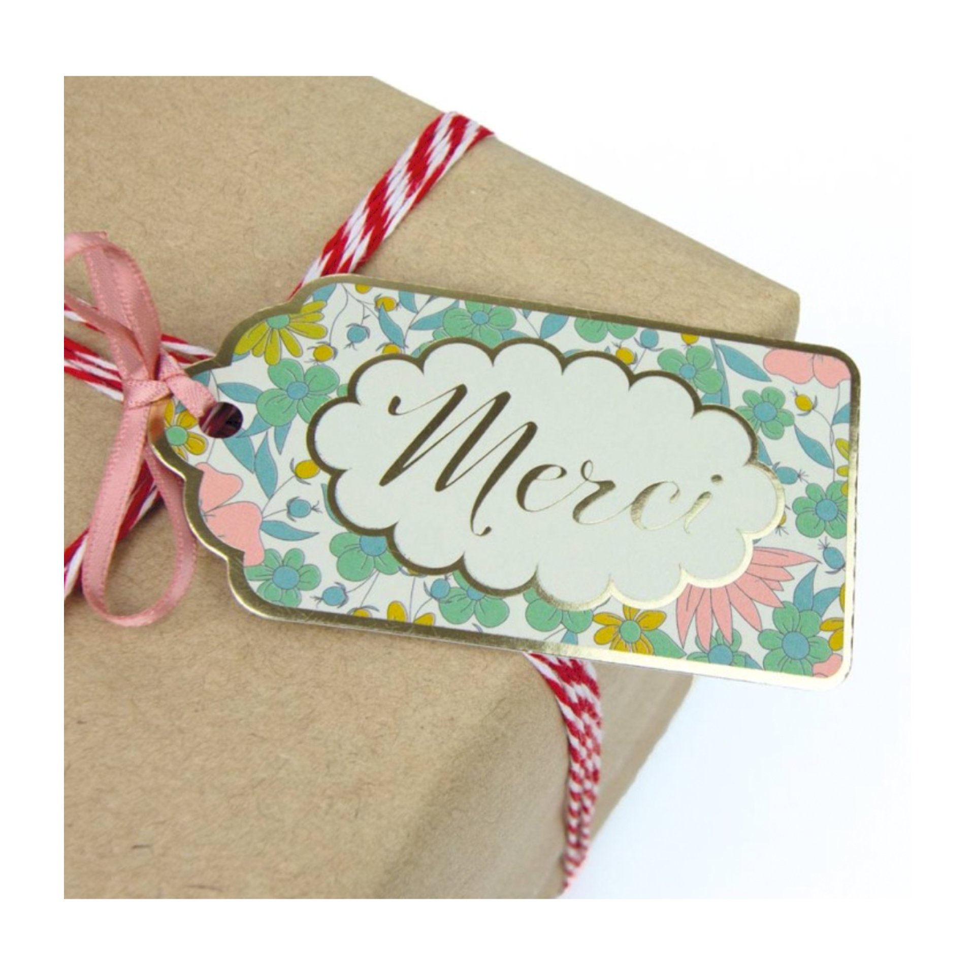 Etiquette "Merci" motif floral Shabby et liseré Or, avec ruban rose