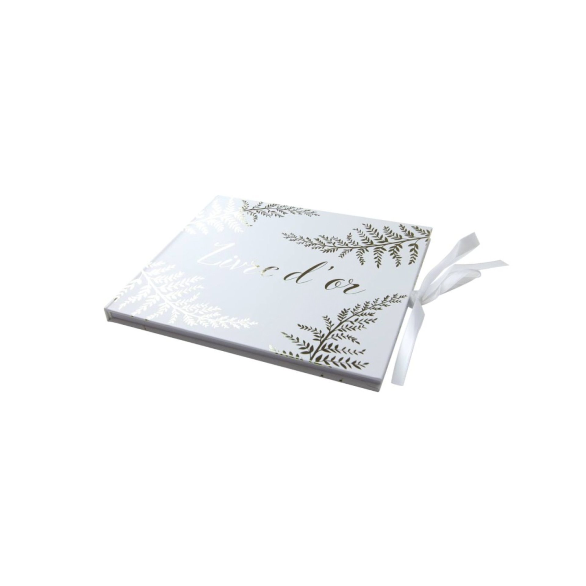 Livre d'or blanc avec motif "Fougère" doré et ruban de fermeture blanc.