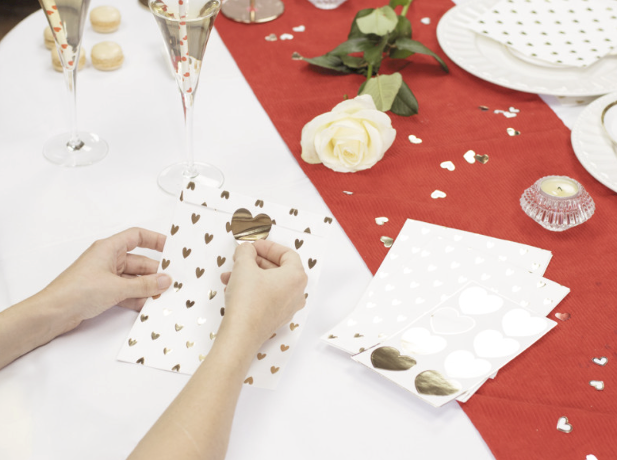 Lot de 8 pochettes en papier blanc avec motif petits coeurs dorés + 8 stickers coeurs dorés