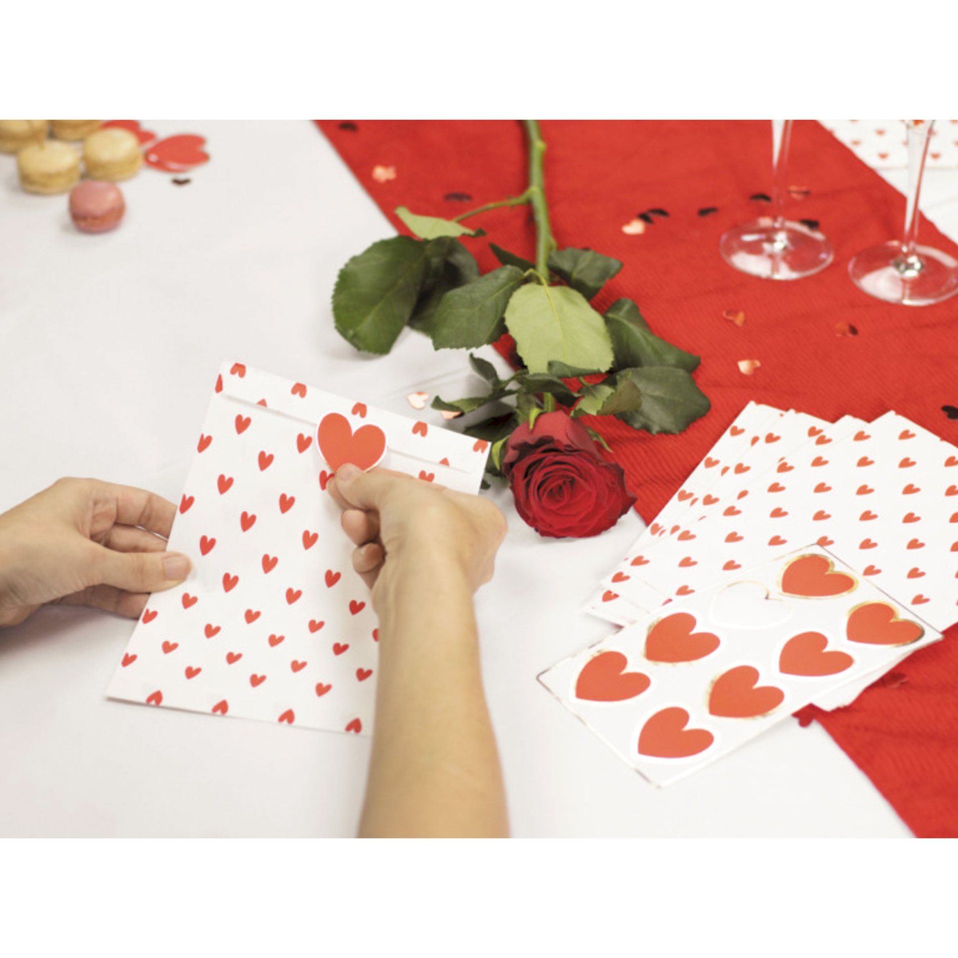 Lot de 8 pochettes en papier blanc avec motif petits coeurs rouges + 8 stickers coeurs rouge avec liseré doré