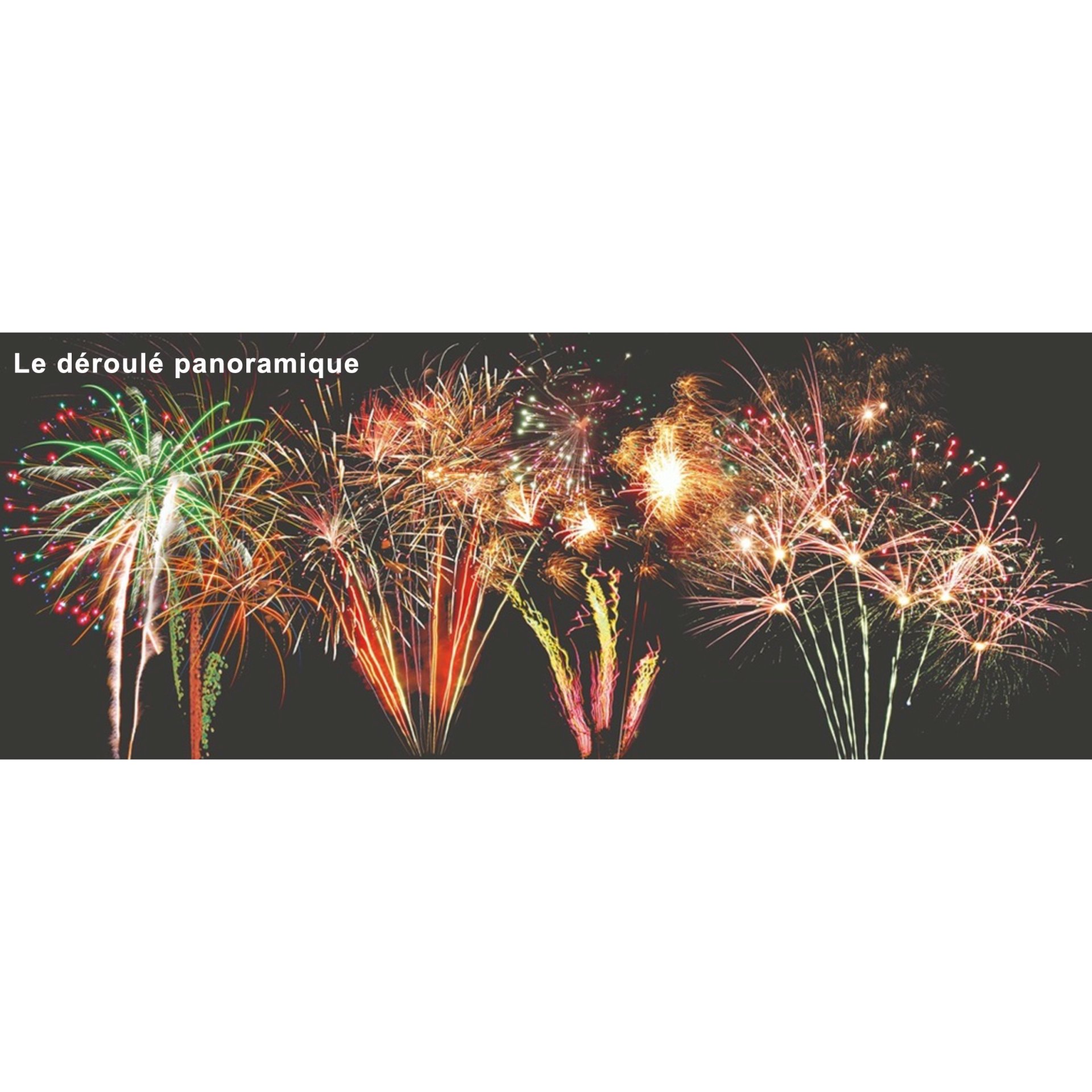TABLEAU n°1 : Queue de comète palmes or et vertes à palmes or et étoiles scintillantes multicolores et or, étoiles bleues et frétillantes argent, queue de comète rouge verte à palmes et chrysanthème rouge vert, or et pluie crépitante.